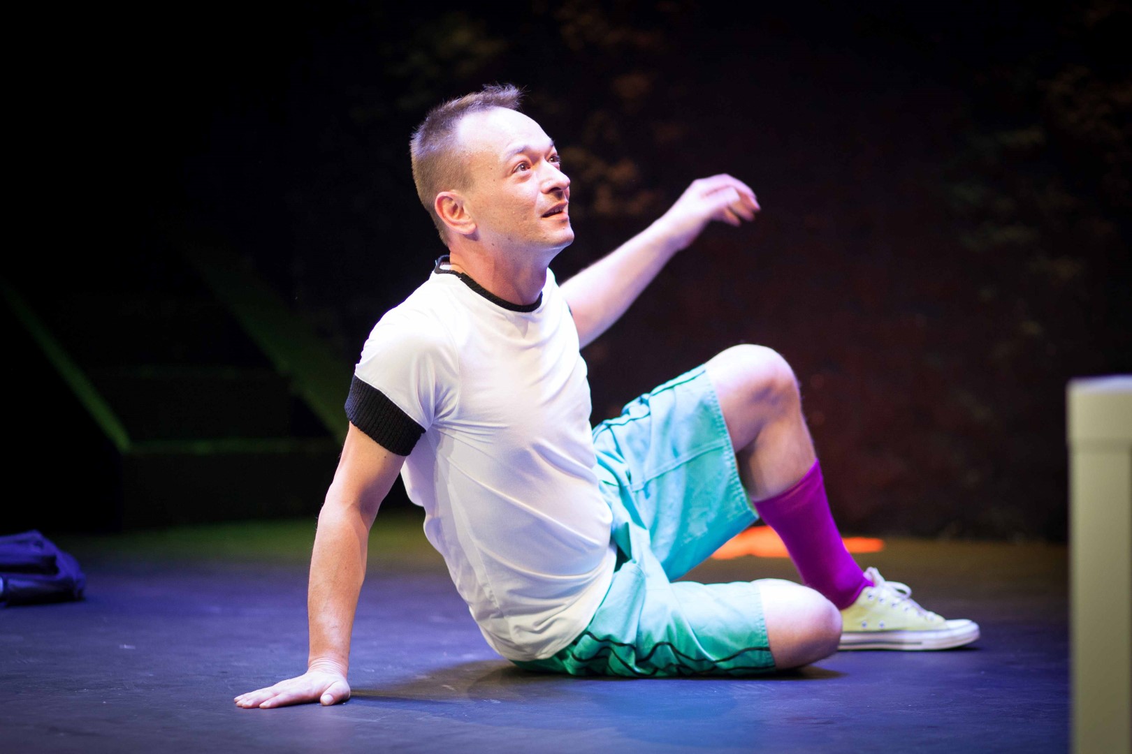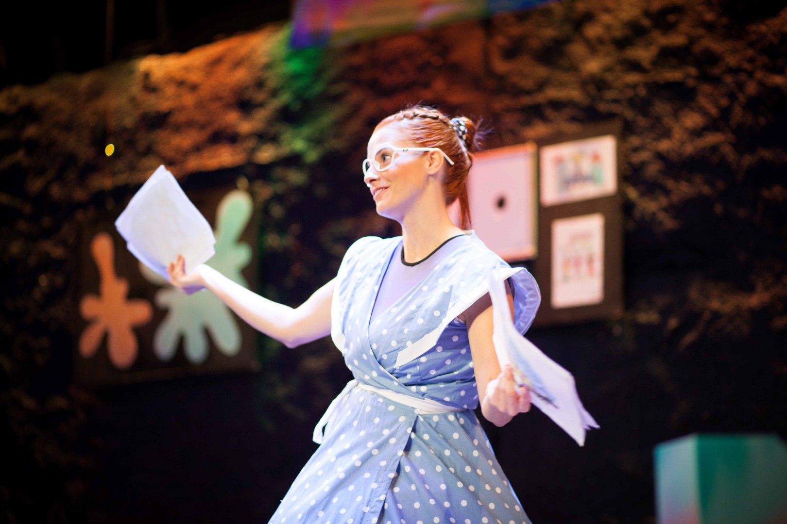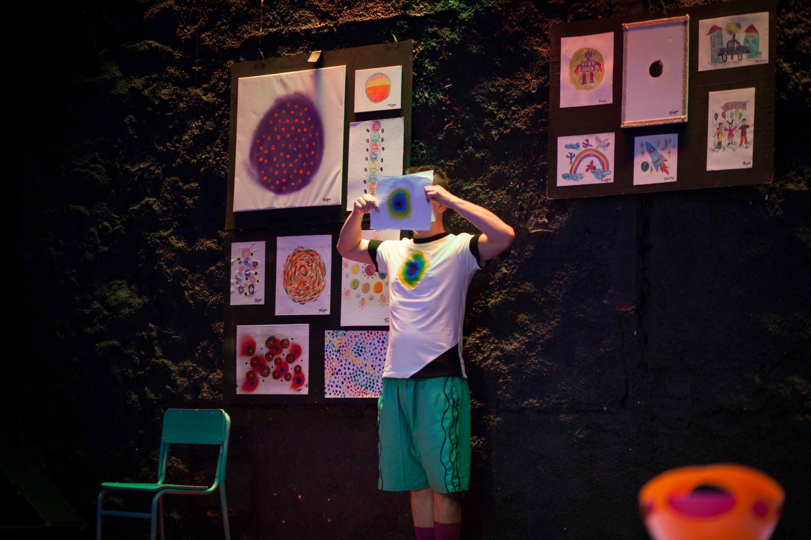 • Β’ Ενότητα: Στο βιωματικό εργαστήριο που ακολουθεί, τα παιδιά δημιουργούν μια μεγάλη ομαδική ζωγραφιά με ελεύθερα σχέδια και χρώματα, η οποία στη συνέχεια γίνεται αφορμή για να πλάσουν τη δική τους ιστορία. Η ζωγραφιά αυτή μένει στα παιδιά ως αναμνηστικό στα σχολεία που φιλοξενούν την παράσταση.
