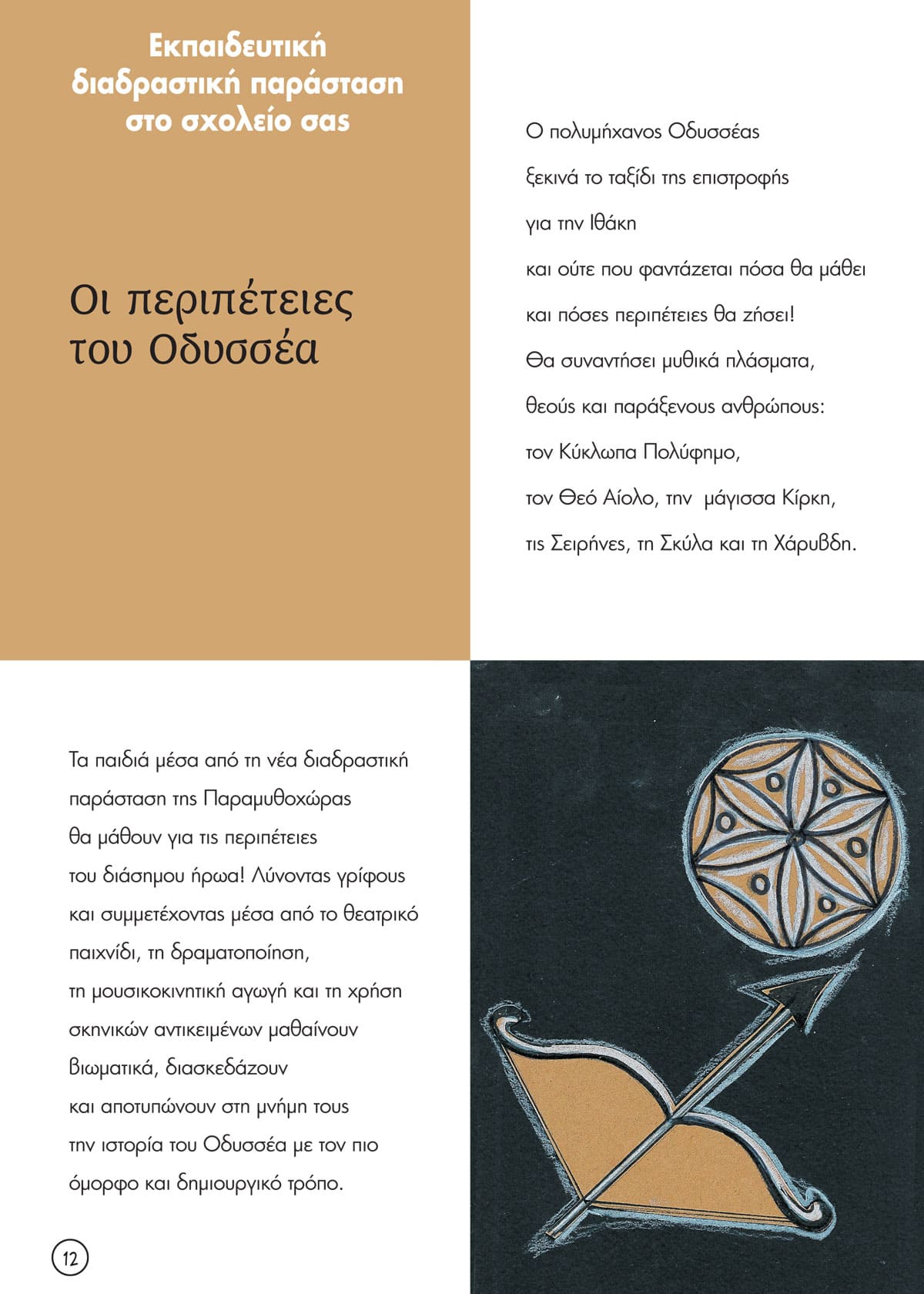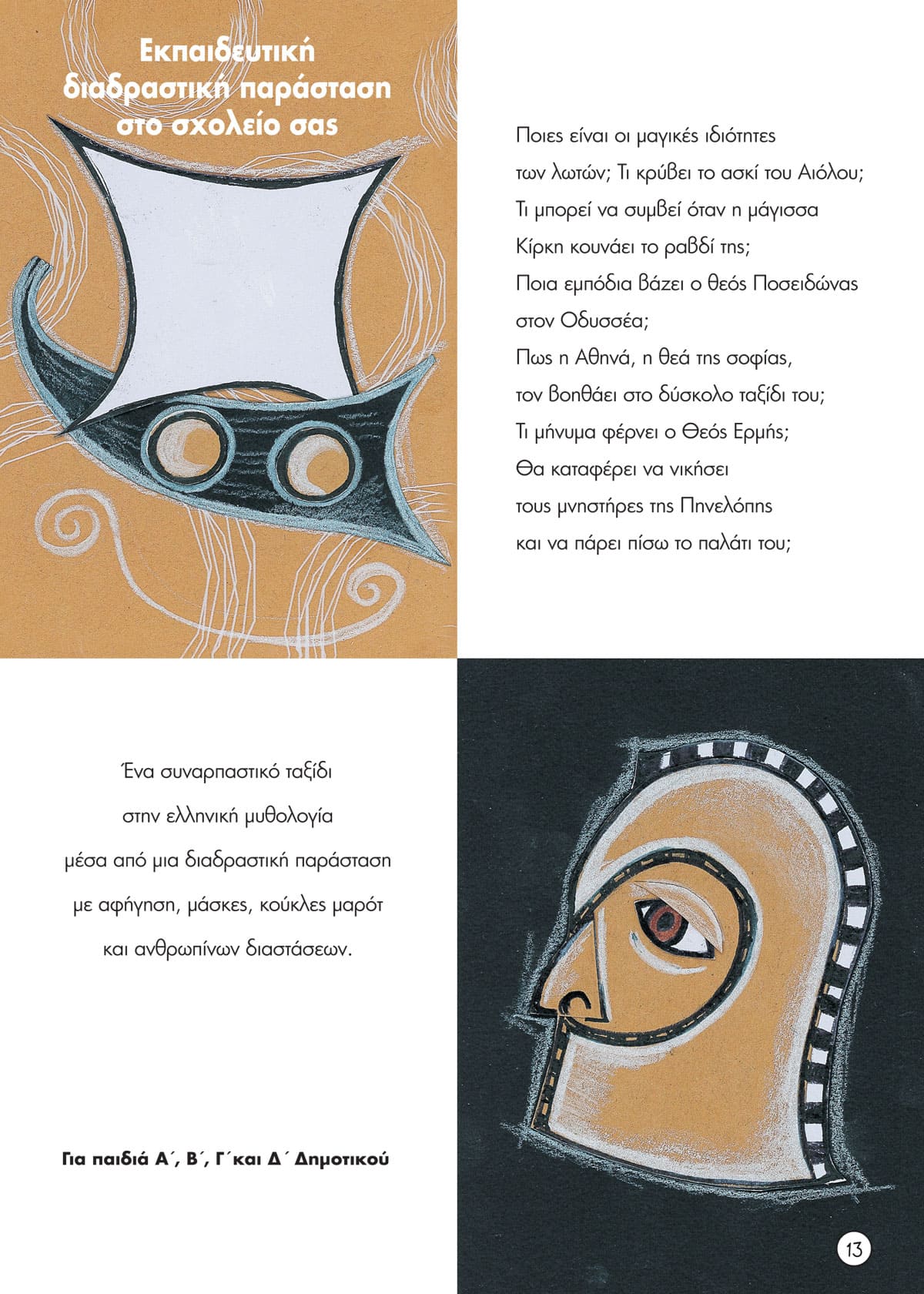Οι περιπέτειες του Οδυσσέα, η νέα εκπαιδευτική διαδραστική παράσταση ταξιδεύει στα σχολεία! Τα παιδιά λύνοντας γρίφους και συμμετέχοντας μέσα από το θεατρικό παιχνίδι, τη δραματοποίηση, μαθαίνουν βιωματικά, διασκεδάζουν και αποτυπώνουν στη μνήμη τους την ιστορία του Οδυσσέα με τον πιο όμορφο και δημιουργικό τρόπο.