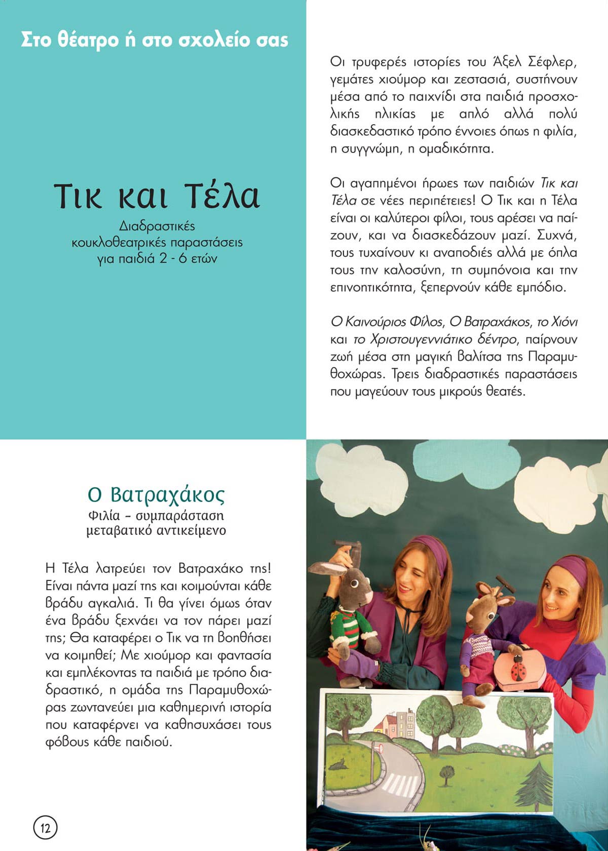 Επίσης για περιορισμένο αριθμό παραστάσεων θα παρουσιαστουν στο θέατρο αλλά και σε σχολεία και ιστορίες του Τικ και της Τέλα! Ο Βατραχάκος, το Χιόνι και το Χριστουγεννιάτικο Δέντρο, παίρνουν ζωή και ταξιδεύουν τα παιδιά στον κόσμο του Άξελ Σέφλερ, έναν κόσμο γεμάτο τρυφερότητα, χιούμορ και υπέροχα μηνύματα.