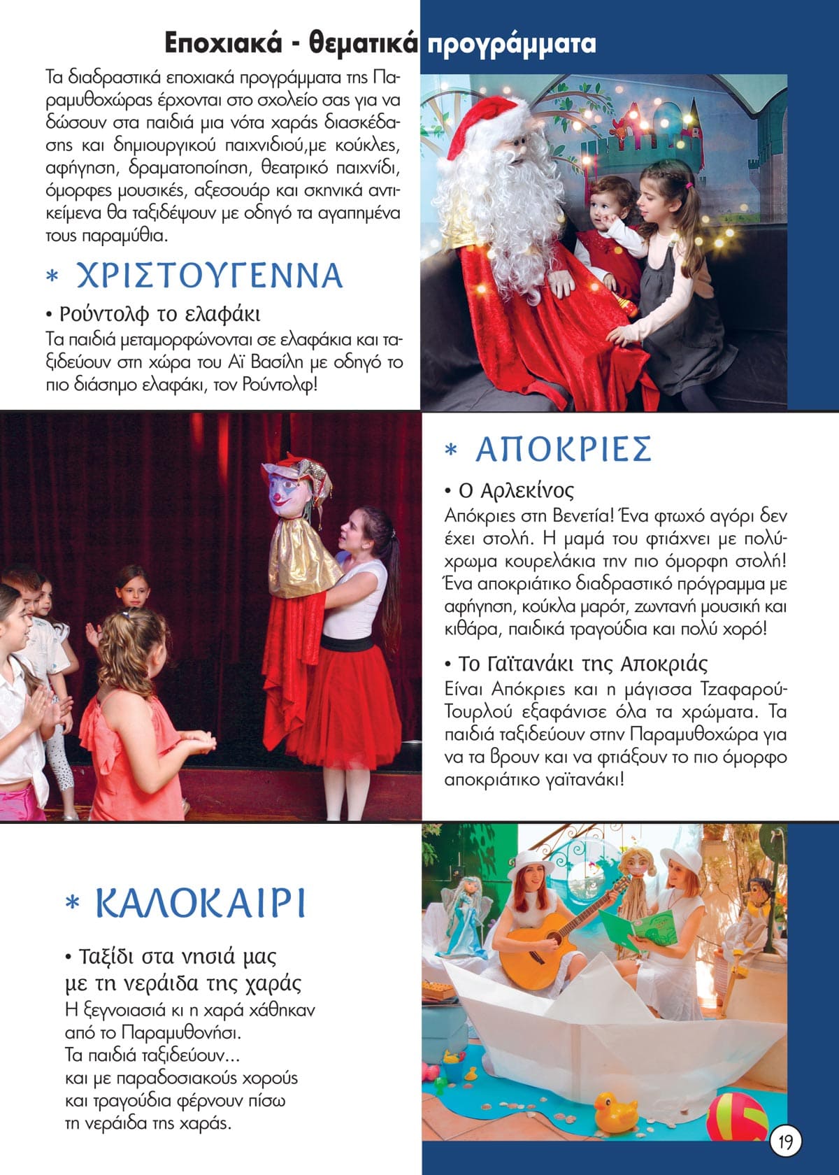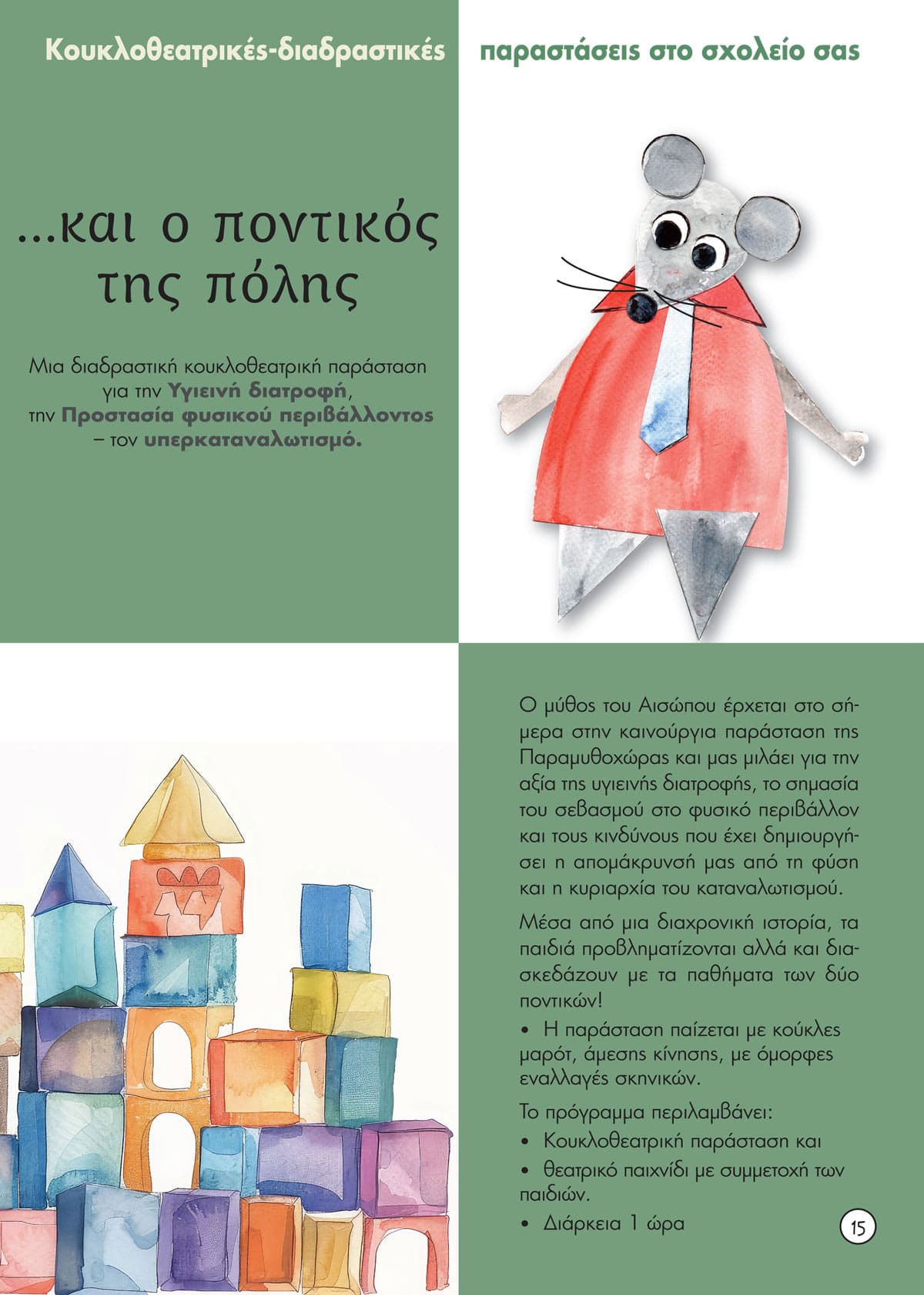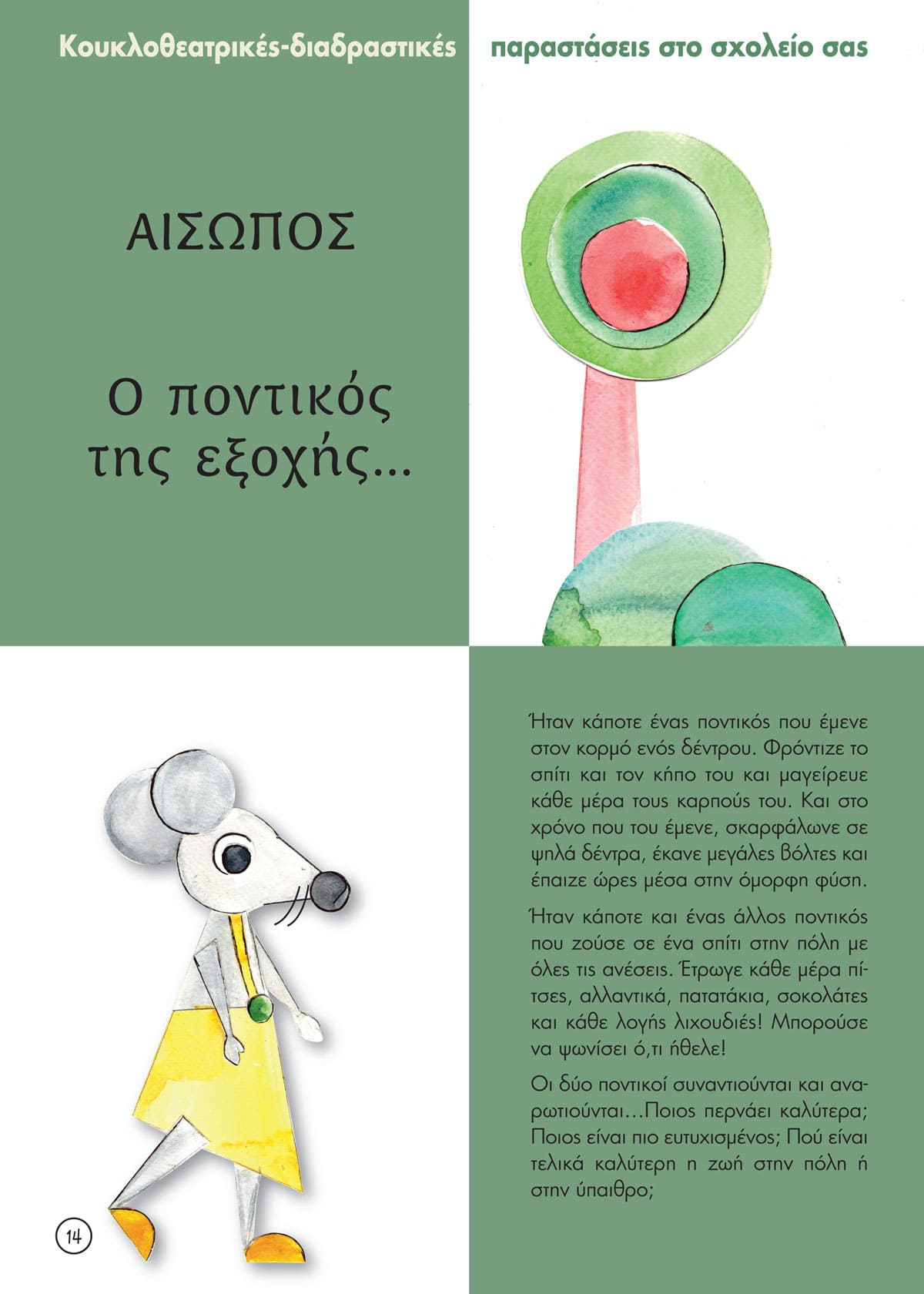 Η νέα παράσταση από τους Μύθους του Αισώπου: Ο ποντικός της εξοχής και ο ποντικός της πόλης , ένα παραμύθι για το περιβάλλον και την υγιεινή διατροφή. Κλασικά παραμύθια –Το Ασχημόπαπο, Τα τρία γουρουνάκια και η Βασίλισσα του Χιονιού, ο Ρούντολφ – που μας μιλούν για τη διαφορετικότητα, το bulling, τη δύναμη της φιλίας και την αξία της συνεργασίας και το αντιπολεμικό παραμύθι Ταξίδι με τον Σεβάχ, για την αξία της Ειρήνης και της αλληλεγγύης.