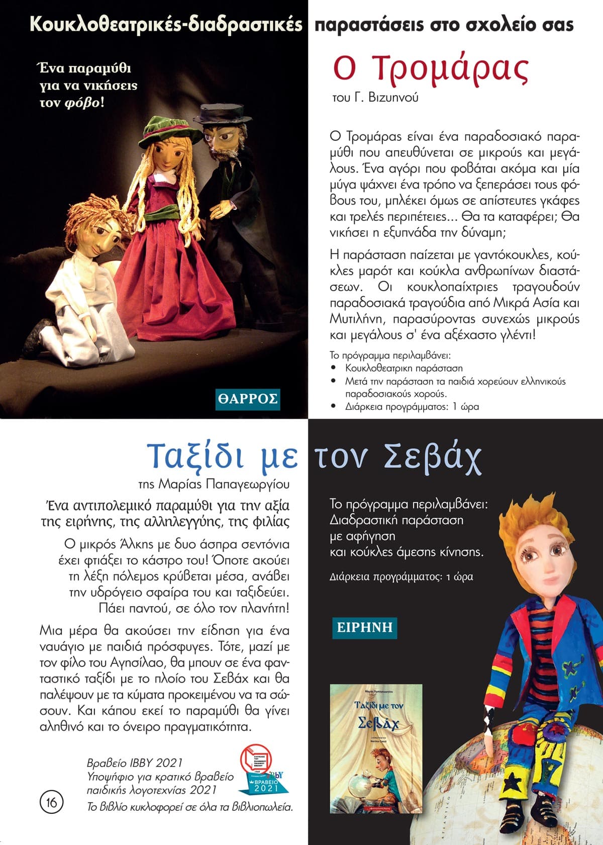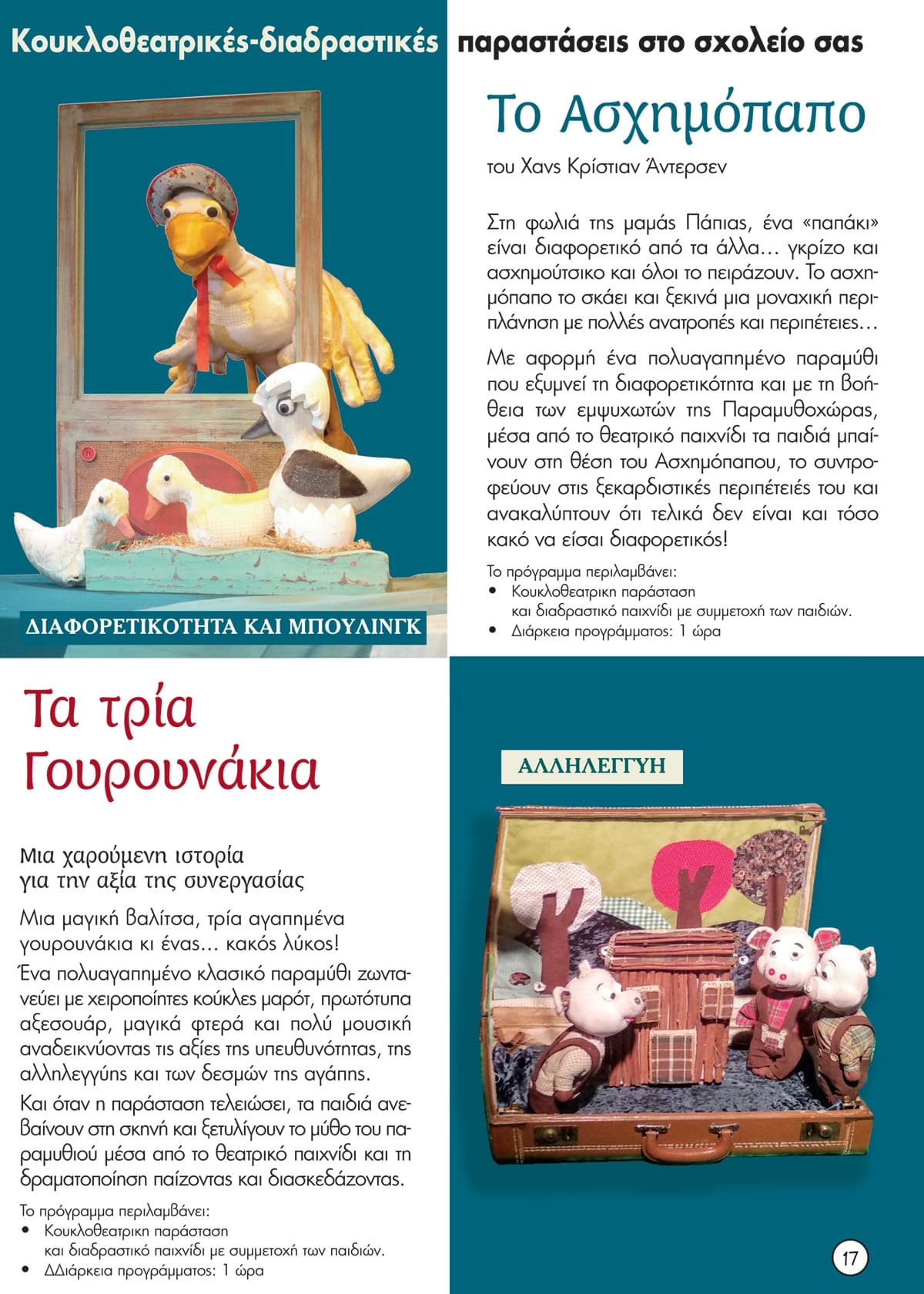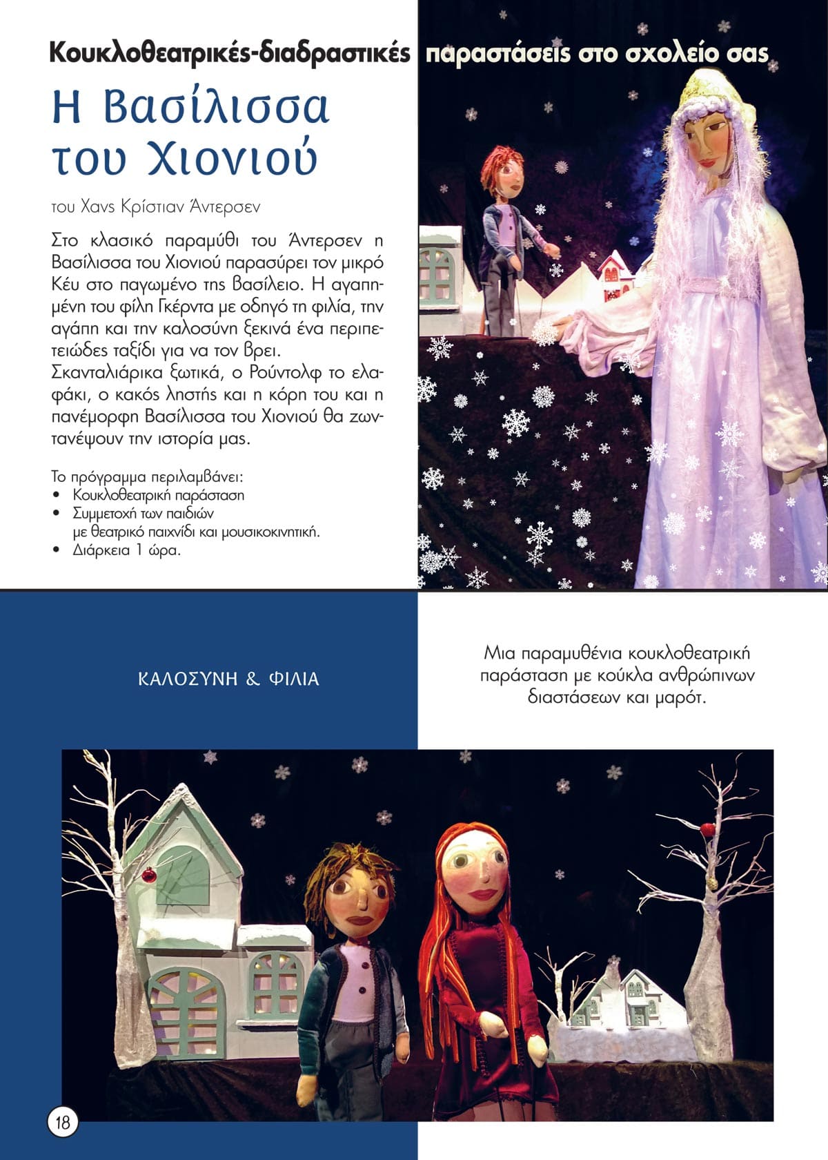 Η νέα παράσταση από τους Μύθους του Αισώπου: Ο ποντικός της εξοχής και ο ποντικός της πόλης , ένα παραμύθι για το περιβάλλον και την υγιεινή διατροφή. Κλασικά παραμύθια –Το Ασχημόπαπο, Τα τρία γουρουνάκια και η Βασίλισσα του Χιονιού, ο Ρούντολφ – που μας μιλούν για τη διαφορετικότητα, το bulling, τη δύναμη της φιλίας και την αξία της συνεργασίας και το αντιπολεμικό παραμύθι Ταξίδι με τον Σεβάχ, για την αξία της Ειρήνης και της αλληλεγγύης.