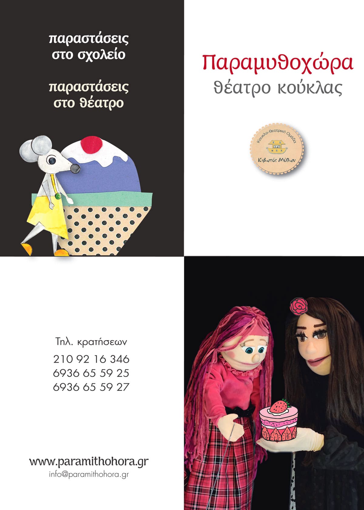 Με περισσότερο από 20 χρόνια αδιάκοπης παρουσίας, η Παραμυθοχώρα παρουσιάζει παραστάσεις υψηλής ποιότητας και αισθητικής για παιδιά προσχολικής και νηπιακής ηλικίας και για παιδιά Α΄, Β΄, Γ΄, Δ΄ δημοτικού.