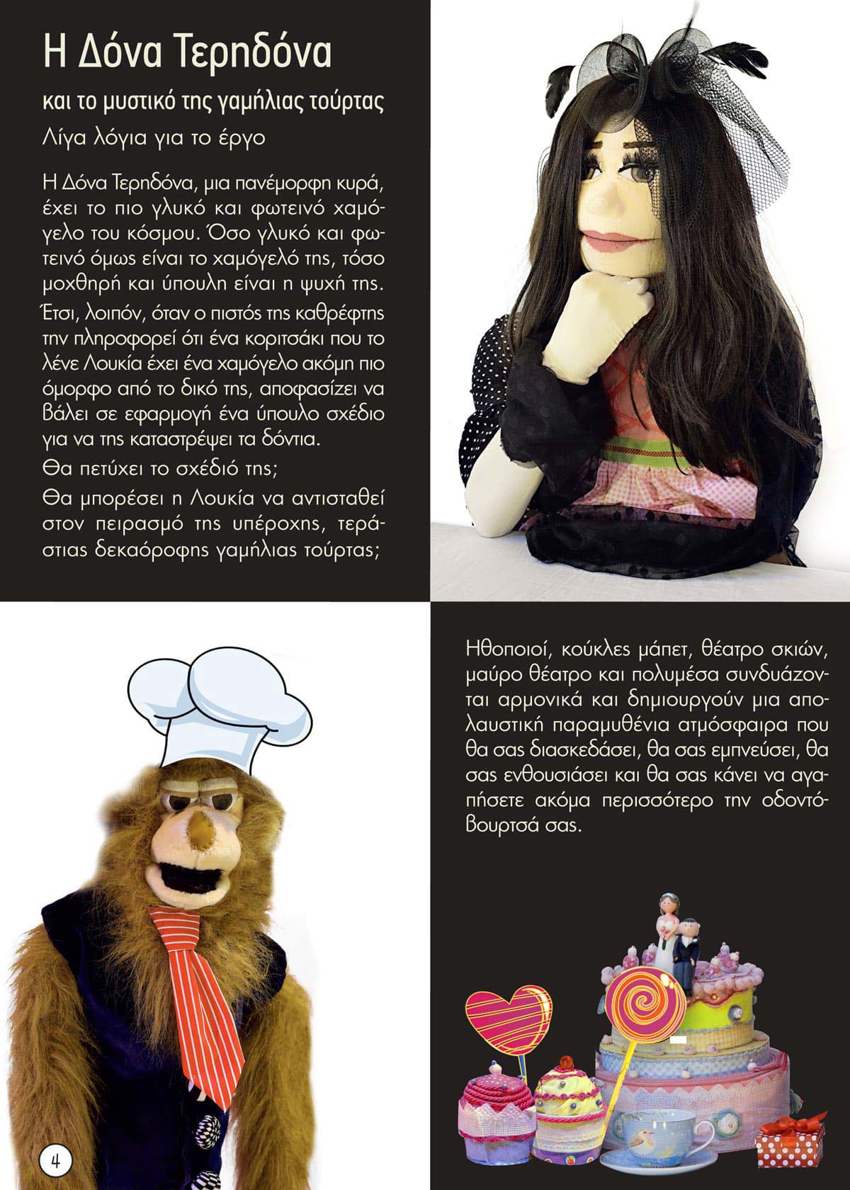 Χρησιμοποιώντας διαφορετικά είδη και τεχνικές η Μαρία και η Σπυριδούλα Παπαγεωργίου δημιουργούν σε κάθε παράσταση έναν ξεχωριστό κόσμο που κεντρίζει το ενδιαφέρον των παιδιών και τα ενθαρρύνει να δουν με άλλη ματιά τα μικρά και τα μεγάλα που τα απασχολούν. Με πυρήνα κλασικές αλλά και σύγχρονες ιστορίες, οι παραστάσεις της περιόδου 2024-2025 που θα παρουσιάζονται καθημερινές για σχολεία και κάθε Κυριακή για το κοινό στο Θέατρο 104.